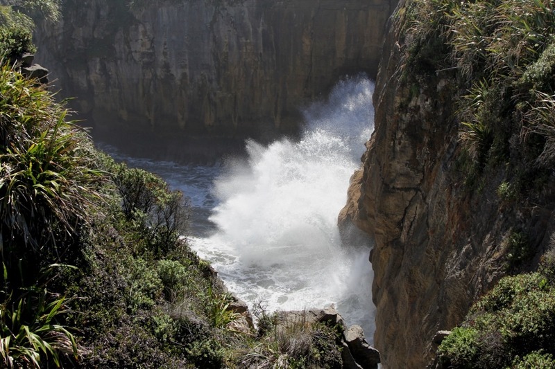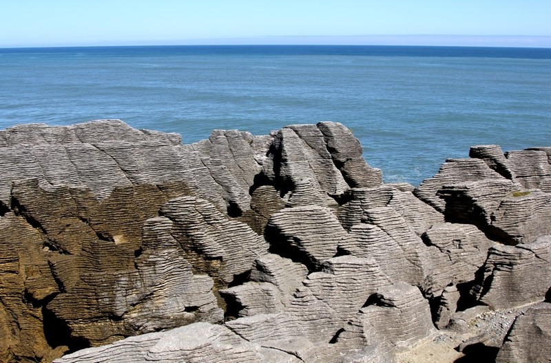 Von Greymouth geht es an der Küste weiter Richtung Westport. Da die Camper sich wieder schön an den natürlichen Tagesrhythmus gewöhnen, also ca. um 10 Uhr im Bett, dafür um 8 Uhr wach, sind wir trotz Fahrt zur Mittagszeit an den Pancake Rocks. Hier haben Ablagerungs-Intervalle irgendwie (so genau weiß das keiner) für eine Struktur gesorgt, sie aussieht als ob ein ganzer Stapel Pfannkuchen übereinander liegt.