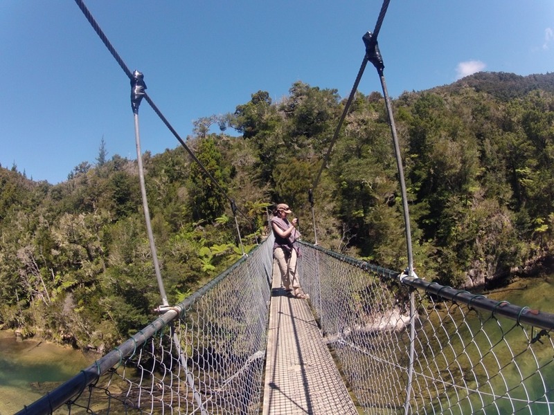 Bei Westport verlassen wir leider schon wieder die Küste, denn unsere nächste Station liegt im Nord Westen, der Abel Tasman Nationalpark. Die Fahrt führt durch die Bullers Gorge, eine Schlucht, die mal wieder mit sehr kurvigen Stassen gesäumt ist. Mitten drin machen wir auf einem DOC halt damit sich Dominik seine nächste Ladung Sandflies abholen kann. Am nächsten Morgen halten wir Along the Road an einen kurzen Waldweg und überqueren NZ längste Swingbridge (ca 100 m).